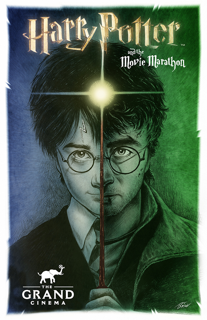 This first poster wasn't for the Weird Elephant showings, but for the annual Harry Potter Marathon, a back to back screening of all 8 films over a 24 hour period! I was tempted to do an elaborate piece with lots of characters, but I just didn't have that much time -- since I don't have a Time-Turner. So I came up with this concept of a divided portrait of the young hero, showing the early Harry on one side of the wand and the older Harry on the other side. A simple and I thought effective way of bridging the 8 film epic!